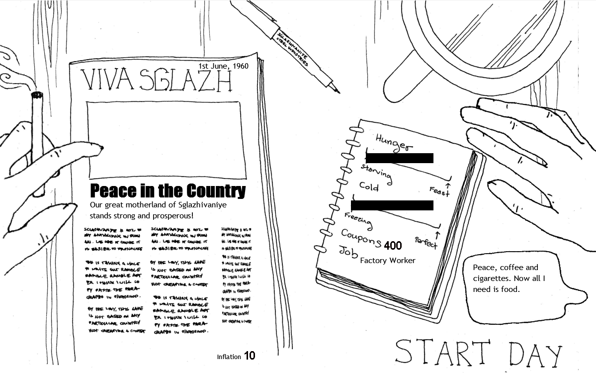 My first instinct was to talk to friends who's parents had lived through those times and they supplied with very interesting stories, both bitter and funny. A lot of inside jokes made it into the game, from the cabbages, to the shadow characters, the names of the counties, to the very expensive bananas, I originally wanted to vaguely follow the history of Czechoslovakia which had a very interesting good first years, called the kind face of communism, up to the Prague spring in 68. Mechanically, it could translate quite well into an easy start of game before hitting 1968 where things would get more difficult. But a lack of time meant condensing it into something completely different.
