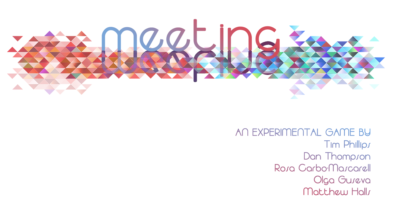 "You are trapped. So are they. You will need to work together if you want to escape in time, solving puzzles to break down the virtual barriers that separate you. Meeting is a game for two players who sit in the same room yet play on different computers. So grab a friend, set yourselves up and get going. For the ultimate challenge you should avoid looking at your partner's screen. And remember: communication is the key to success!"