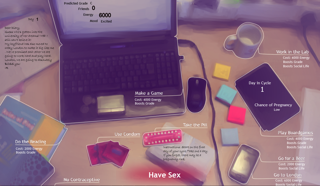 The goal was this: Create a game that would voice a problem a lot of young women have to face. Namely, (if they wish to) not getting pregnant. You play a young woman who is starting university with the aim to get amazing grades and great friends. Her boyfriend moved with her and the last thing she needs on her plate is a pregnancy. The game is one of balancing fertility, contraception and its effects with day to day life.