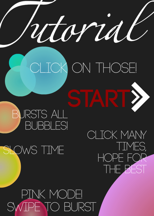 A few of the things that changed along the way: At first the bubbles moved upward when you clicked on them. However we found the popping more satisfying in a popping-bubble-wrap sort of way. We added bigger and smaller bubbles along with a health bar that dies from every hit. There are different colour bubbles that have power-ups. For example a yellow bubble swipes the screen clean, an orange one slows the bubbles down and a pink one puts you in super mode. There is also a big boss that takes 20 clicks to kill. We also added in a hardcore mode with more bubbles and insane clicking.