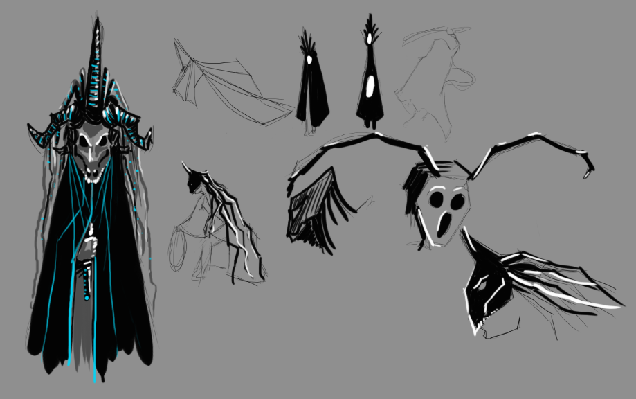 We wanted to communicate a tribal cyberpunk cult, a blending that proved challenging. There are quite a few things I would change to the character I had at the end of the class. For example, the side horns, while quite aggressive, feel too goat-like. These cultist are sacrificing unicorns and wearing their skulls therefore the anatomy of it needs to be appropriate. The blue lines in the drawing were added after a brief discussion with our professor on how to communicate cyberpunk. While it's true that lights are the most signifying of cyberpunk, it feels inappropriate to that world. Instead, I would like to try drawing more inspiration from Italian futurism or Lebbeus Woods. My final problem is with the dagger. A good communicator of this high-tech future is in their tools. With more time I would have given it it's own design analysis.
